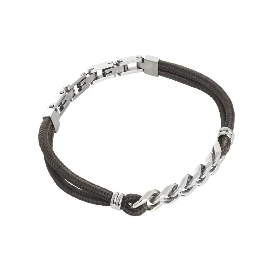 Bracciale con maglie modulari in acciaio bianco 316L, doppio filo in cordino marino marrone con centrale intrecciato in acciaio 316L. Triplice indosso: lunghezza cm 18, cm 19,5; cm 21.