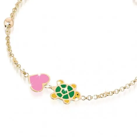 Bracciale le Bebé collezione Primegioie. Bracciale in oro giallo 9 kt con elementi a forma di tartaruga e cuore smaltati. Qui la fortuna è una soltanto, in tante forme è al mio fianco.